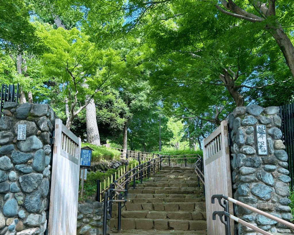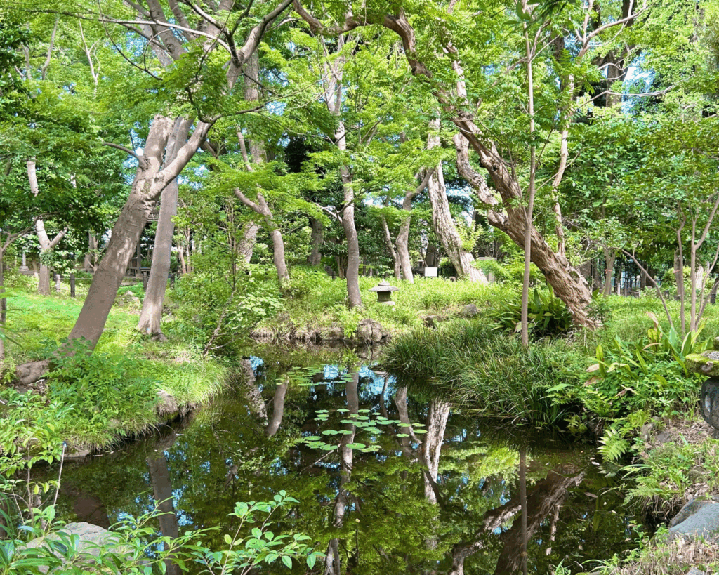 蘇峰公園は植え込みや梅林、池、東屋などで構成された、侘び寂びを感じさせる落ち着いた雰囲気の庭園です。公園の樹木の中でも特に有名な「カタルパの木」という、蘇峰の生涯の師である新島襄(にいじま じょう)にゆかりのある木(新島襄がアメリカから持ち帰った種から育ったものの三代目)が植えられています。秋には紅葉スポットとしても知られています。