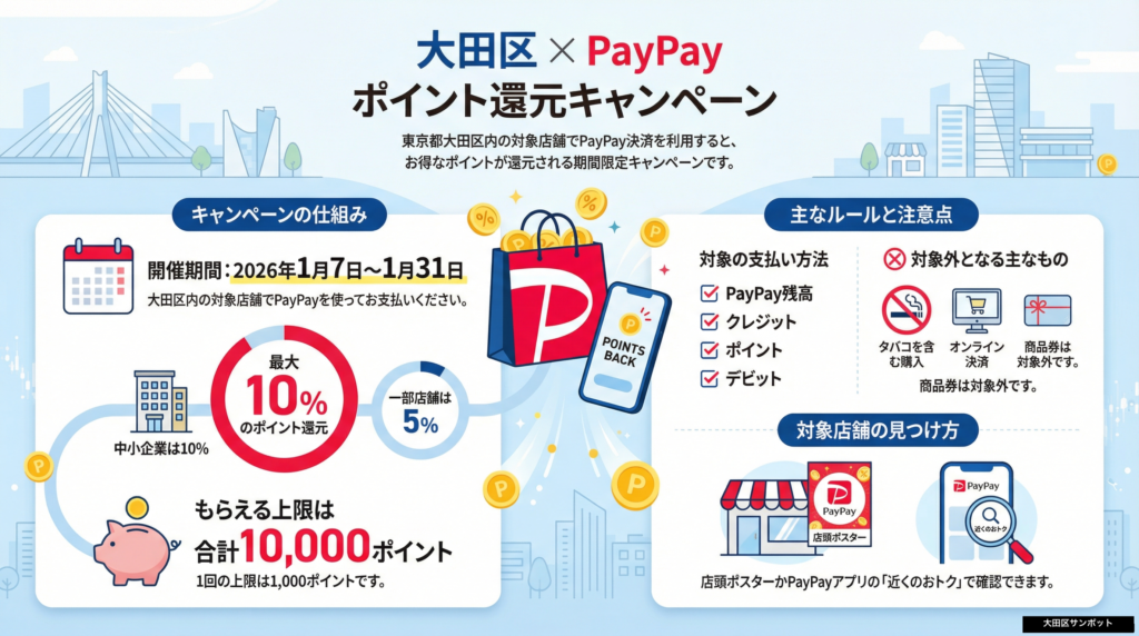 東京都大田区とPayPayが協力し、区内の対象店舗でポイントが還元される「キャッシュレスで生活応援!大田区でポイントが戻ってくるキャンペーン」が実施されます。物価高が続く中、日々の買い物を賢くお得に楽しむ絶好のチャンスです!