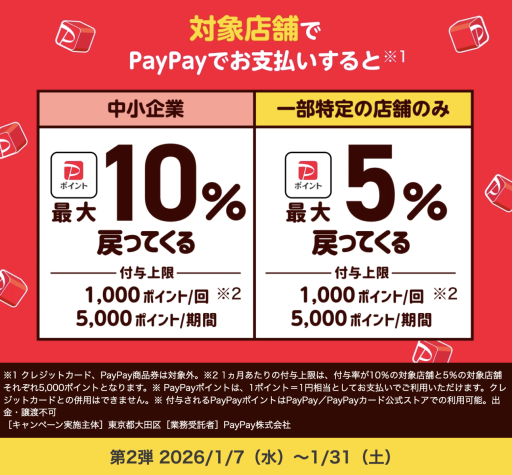 2026/1/7~2026/1/31 対象店舗でPayPayでお支払いすると、ポイントが戻ってくるキャンペーンが開始されました。