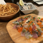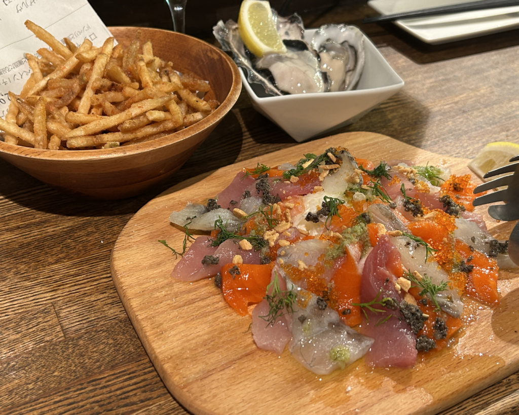 こちらの代名詞とも言えるのが、その日一番の鮮魚を山盛りにした「刺身カルパッチョ盛り合わせ」です。オリーブオイルとこだわりの塩が、魚本来の甘みを最大限に引き立てます。また、魚介の旨みが一滴残らず凝縮された「アクアパッツァ」や、濃厚なソースが自慢の「ウニパスタ」も、訪れる人の多くが注文する看板メニュー。カジュアルな雰囲気ながら、調理は本格派。一皿一皿にボリュームがあり、仲間内でシェアしながら楽しむのにぴったりです。