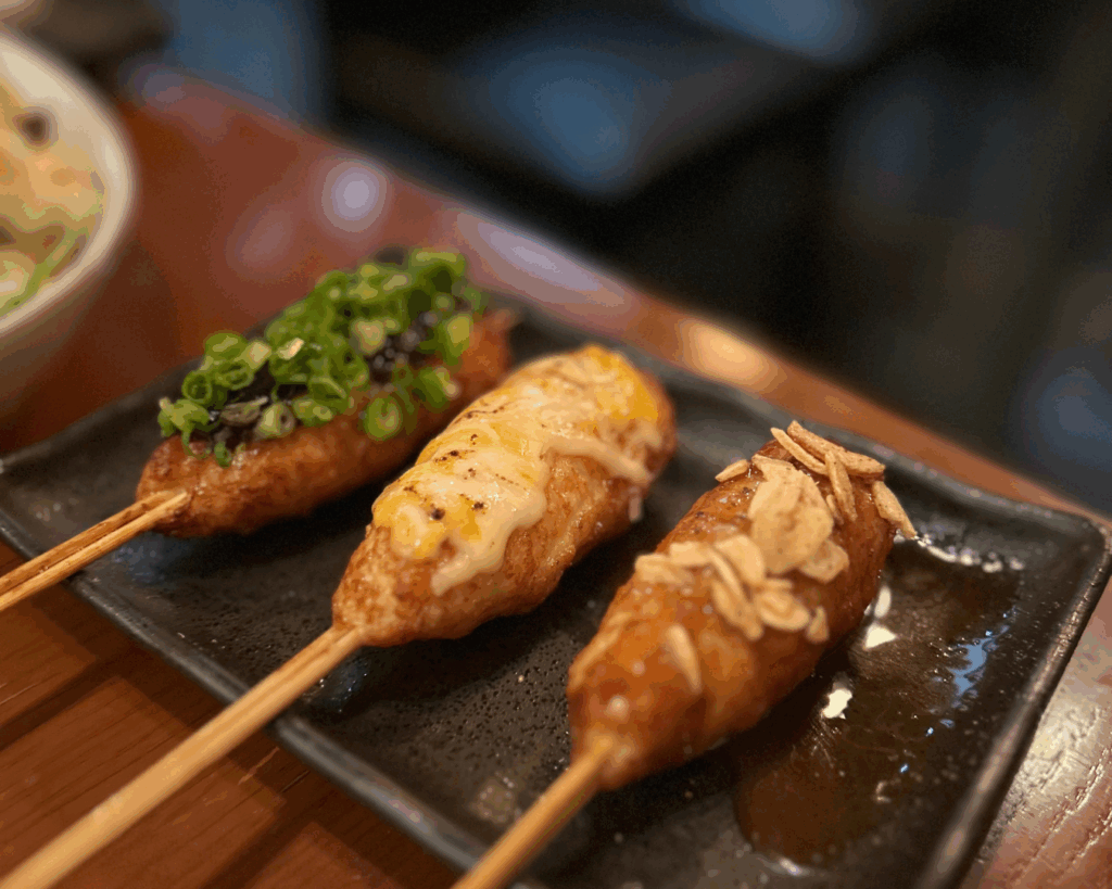 彩り豊かな巻き串: マトや芽ニンニクなど、彩り鮮やかな野菜をベーコンで巻いた串は、さっぱりとした食べ応えで次々にお酒が進みます。「チートデイじゃなくても大丈夫」と思えるヘルシーさも嬉しいポイントです。