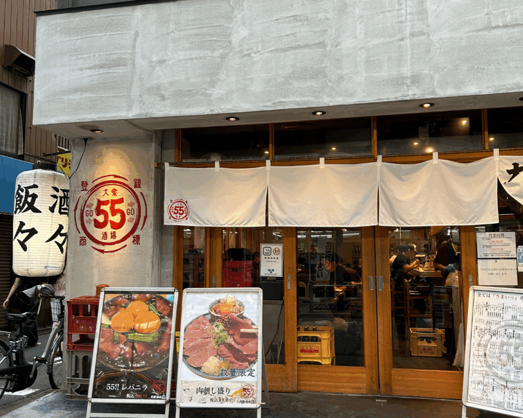 シンプルながらもスタイリッシュな外観が目を引く【大衆酒場55 蒲田本店】は、鮮度抜群のもつ料理を専門とする人気店です。
