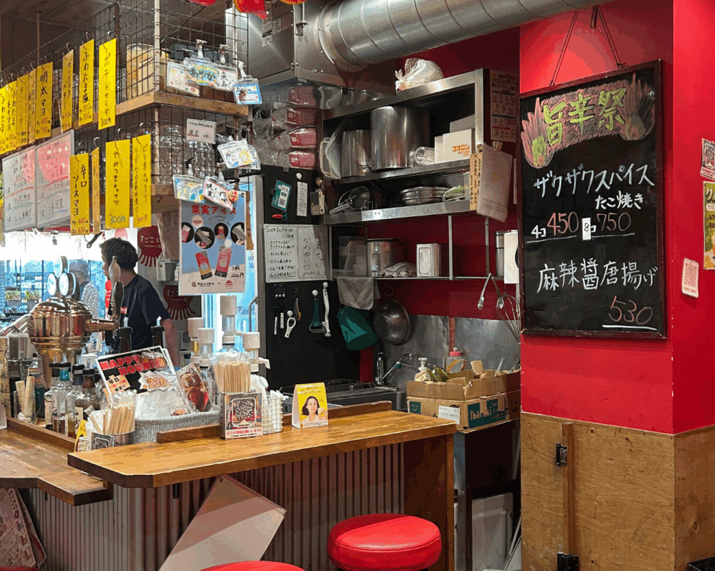 タコちょうちんの優しい灯りが温かいムードを演出する、カジュアルで賑やかな雰囲気の酒場です。鉄板の香ばしい香りと調理の音が心地よく響く空間で、活気に満ちたひとときを楽しめます。