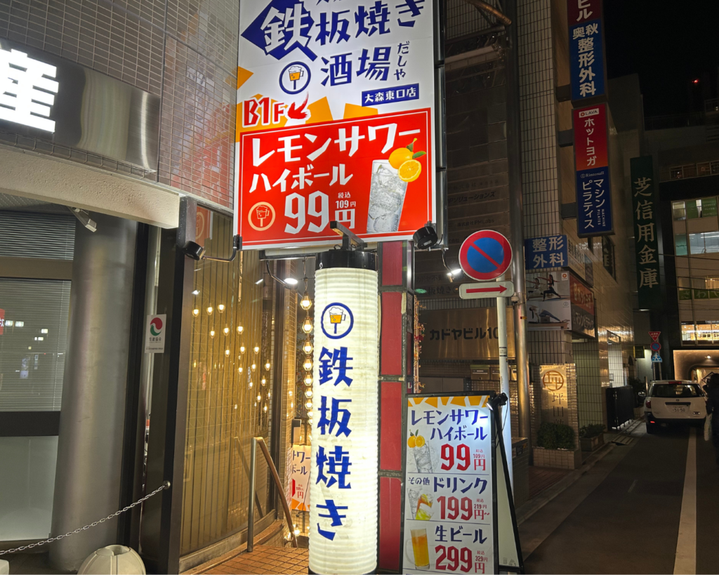 大森駅東口から徒歩3分、地下に広がる活気あふれる空間が「鉄板焼き酒場 だしや 大森東口店」です。ここは、鉄板焼きともんじゃ焼き、そして焼肉までもが一堂に会する、まさに鉄板料理のテーマパークのような一軒です。