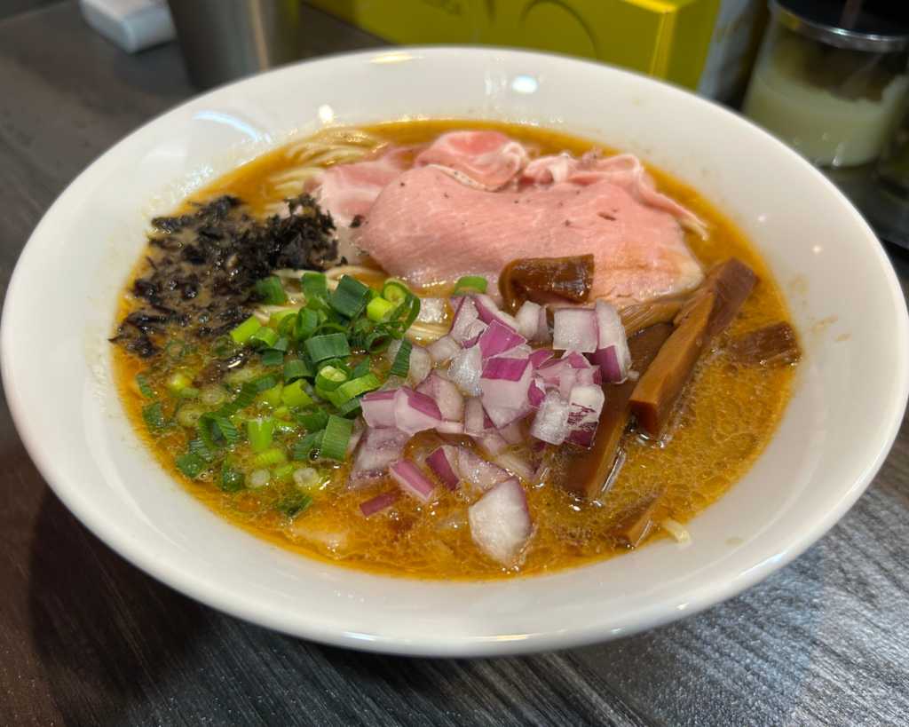 一番の人気メニューは、基本の「蟹そば」です。大量の渡り蟹と濃厚な豚骨スープを合わせた一杯は、とろりとしたスープを口に含んだ瞬間、蟹の芳醇な香りと旨みが爆発的に広がります。合わせる麺は、スープをしっかりと持ち上げる歯切れの良い細ストレート麺。トッピングには、しっとり柔らかな「レアチャーシュー」や、濃厚さを中和するシャキシャキの「玉ねぎ」、そして珍しい「もみじおろし」が添えられており、食べ進めるごとに味の表情が変わります。
