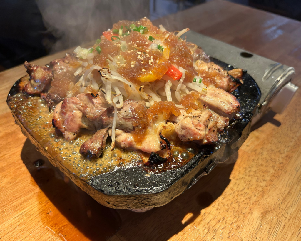 こちらでぜひ味わっていただきたいのが、極厚の溶岩鉄板で一気に焼き上げる「溶岩焼き」です。遠赤外線効果により、肉の水分を逃さずふっくらジューシーに仕上がり、鶏肉本来の力強い旨みが口いっぱいに広がります。また、希少部位の「白レバー炙り」や、鮮度抜群の「京紅モモタタキ刺」は、お酒が進む逸品として外せません。さらに、鶏出汁が染みた「鶏おでん」や、真っ黒な見た目がインパクト抜群の「蒲田ブラックチャーハン」など、遊び心のあるメニューも充実しています。